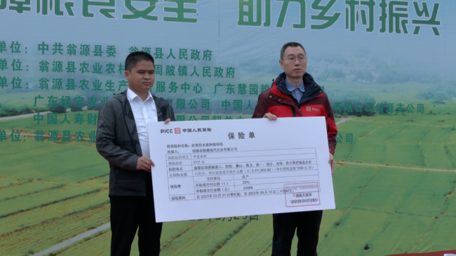 3月29日,在翁源县召开的春耕现代化生产示范现场会上,中国人民财产保险股份有限公司翁源支公司现场为广东慧园粮油有限公司发放保险单,为该公司在翁源县各镇的3111亩早造水稻投入政策性保险保额三百多万元。