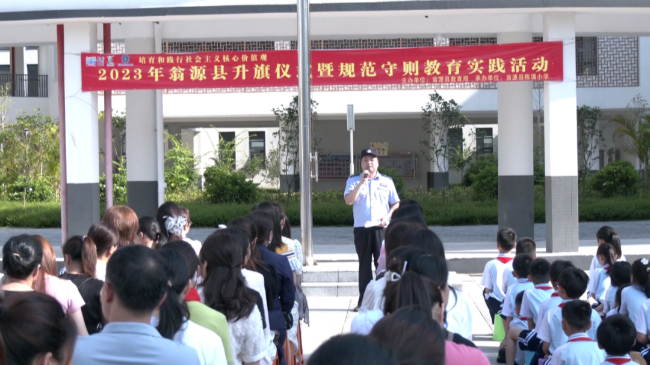 6月12日上午,陈璘小学举行升旗仪式暨规范守则教育实践活动,进一步规范学生的日常行为,促进学生养成良好的行为习惯,该校全体师生及龙仙派出所民警、学生家长代表参加活动。