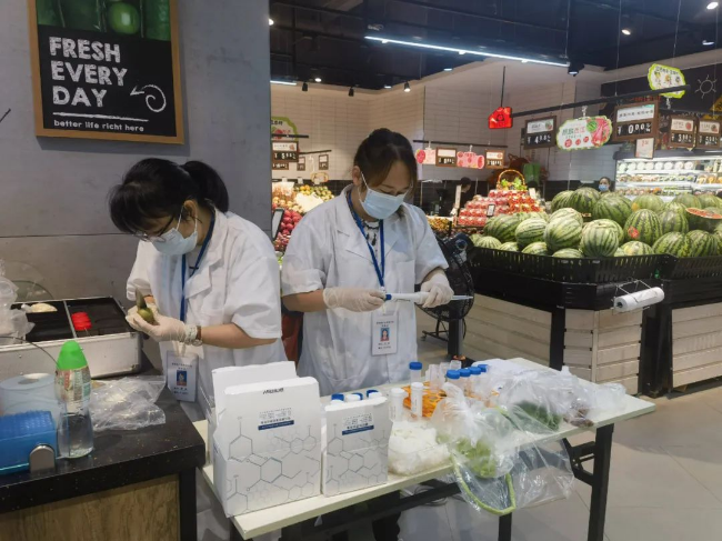 执法人员在监督检查的同时,安排了两名快检工作人员现场对超市销售的部分蔬菜、水果、食品进行农药残留快检,重点检测农药残留指标。经检查,该超市基本符合食品销售日常监督检查要求,销售的湿米粉、食品、蔬菜检测都是合格的、安全的。