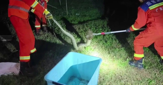 晚上9时许,消防救援队员赶到现场后,鹅场主人已经将蟒蛇控制住,双方配合将蟒蛇装入了事先准备好的收纳箱中。