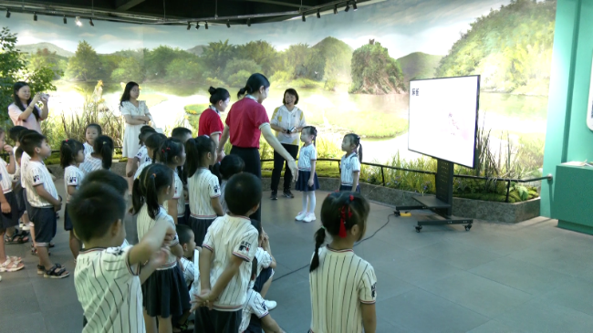 在广东翁源滃江源国家湿地公园湿地科普馆内,蓓蕾实验幼儿园的师生在讲解员的带领下,参观丰富多彩的场馆,听取湿地保护科普知识,开展保护湿地动物常识趣味抢答游戏。