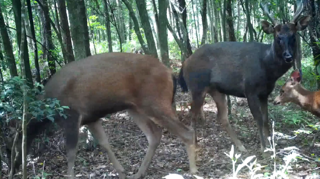 保护区自成立以来,通过开展生物多样性监测摸清资源家底,生物多样性保护成效显著。红外相机已连续多次拍摄到水鹿活动的精彩画面。目前,保护区分布有一个较大的水鹿种群,水鹿种群生存状况良好,种群规模不断发展壮大。