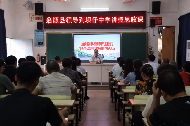 6月11日下午,广东翁源县委常委、宣传部部长何茂文到翁源县坝仔中学为全校50多名教职工上了一堂主题为《加强师风师德建设 锻造高素质教师队伍》的思想政治课。县委宣传部、坝仔镇党委有关负责同志参加聆听。