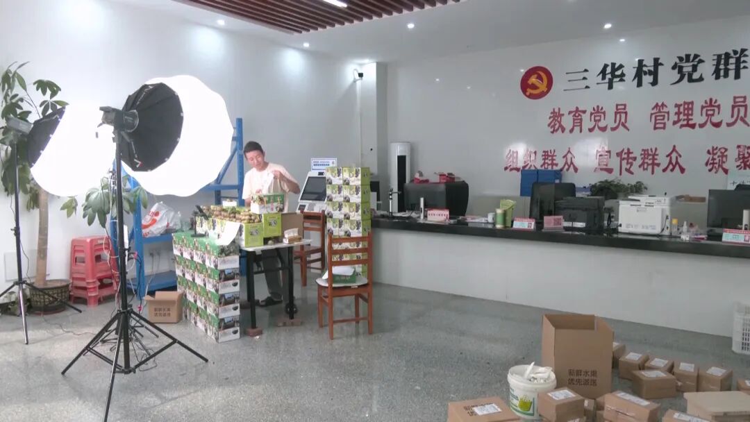 果园内采摘、装箱、运输忙个不停,果园外的销售场景同样热火朝天。在通往果园的道路两旁,有许多果农摆出新鲜采摘的三华李,正等待顾客前来采购。与此同时,经验丰富的直播团队也在三华村党群服务中心内直播带货,详细介绍三华李的口感、品质和营养价值,帮助果农拓宽销路。