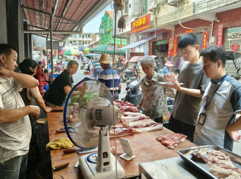 在实地调查阶段,执法人员深入江尾片区各猪肉档铺,以“零容忍”态度对猪肉的进货渠道、检疫检验证明、销售台账等进行了细致检查,并提醒其要严格落实进货查验制度,坚决杜绝不合格猪肉流入市场。